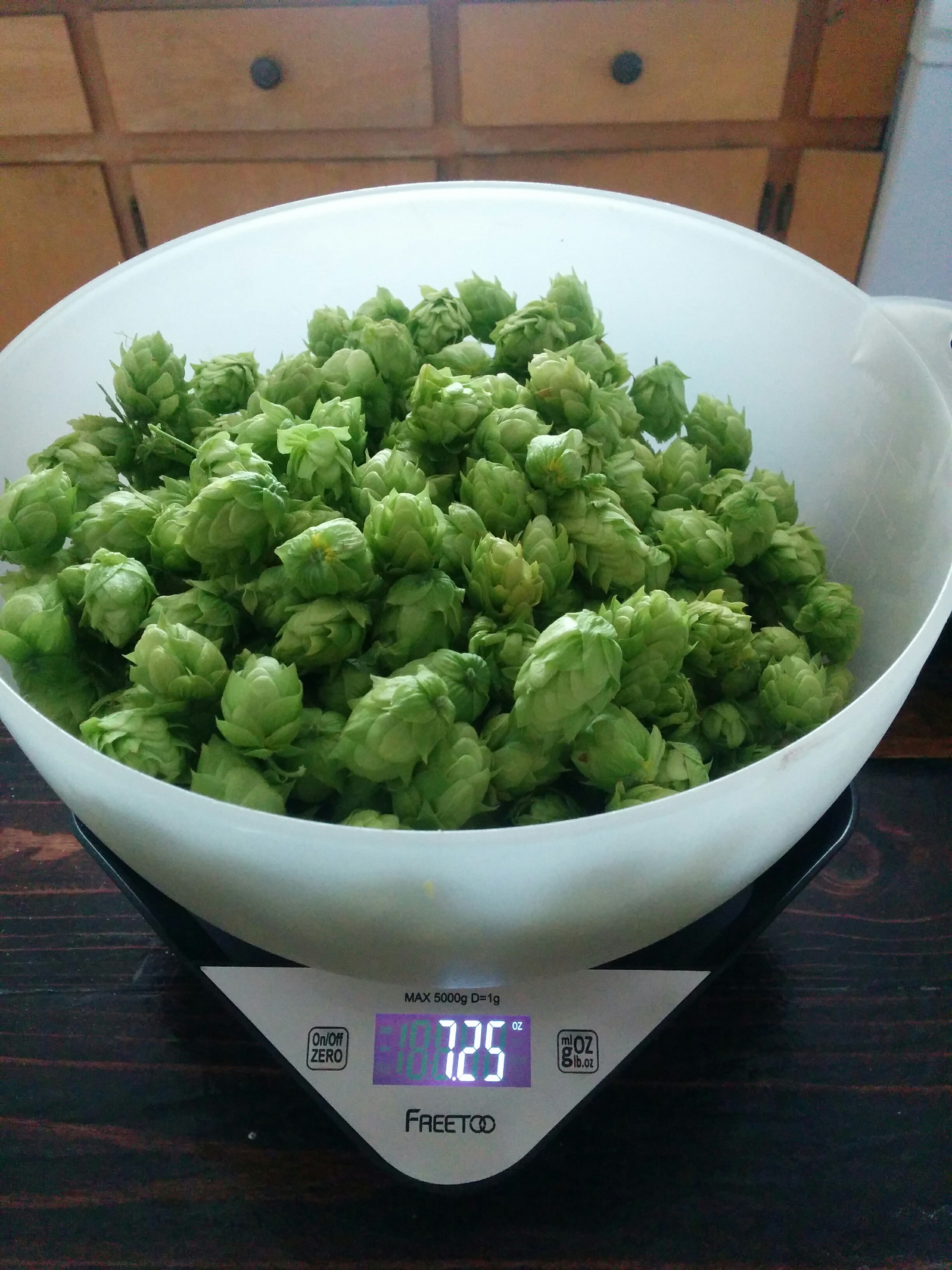 When it comes time to harvest your hops (usually August – September depending on the weather and hop variety), simply pluck them off your trellis. At this point you can cut the bines down if it’s easier to harvest them.